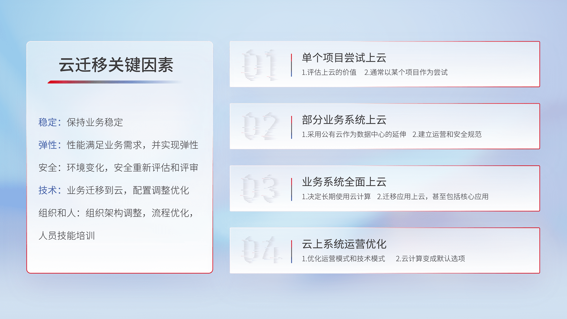 结合实际业务,,,从规划设计、、、、云平台选型、、、云原生改造、、数据迁移、、、集成交付,,,迁移全过程为客户识别最佳上云路径,,做好风险识别管理,,,设计网络架构、、身份权限、、、、安全审计合规、、操作审计、、、、日志审计、、、、监控告警策略、、、多站点容灾设计等,,对云上基础设施进行整体规划,,,,提升IT治理水平,,以满足弹性、、、、高可用、、、、高性能的需求。。。。